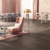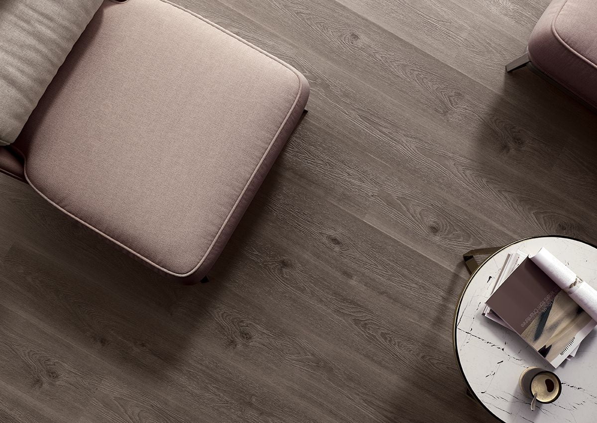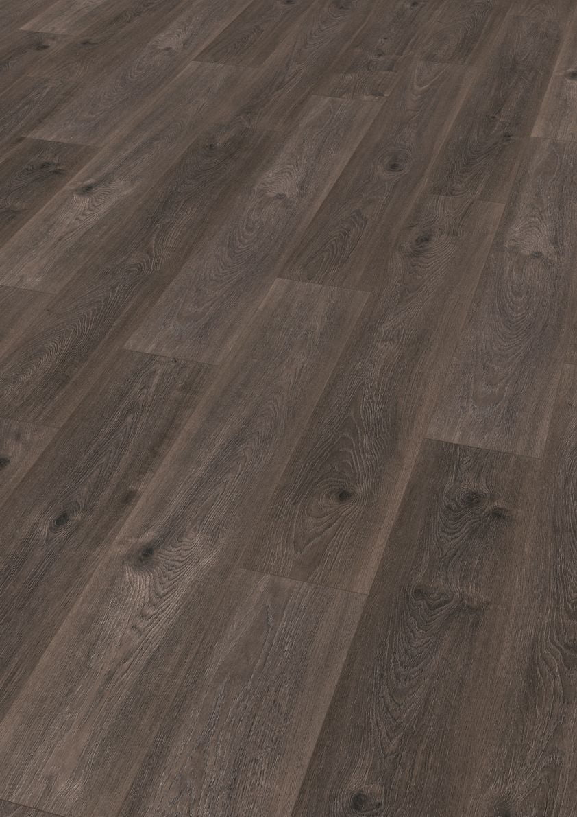 O pavimento flutuante laminado 0AM Dark Arles Oak apresenta uma textura perfeitamente sincronizada com o padrão do carvalho, resultando num acabamento realista de tonalidade escura que confere ao espaço um ambiente moderno e sofisticado. A profundidade visual do design reforça a autenticidade da madeira e valoriza projetos que privilegiam contemporaneidade, carácter e rigor técnico.
