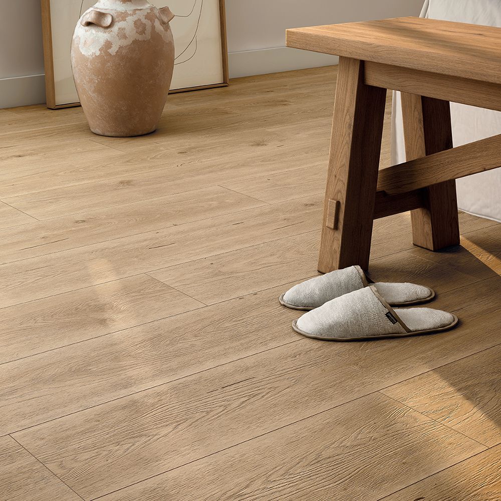 O pavimento flutuante laminado 1AM Natural Wexford Oak expressa um espírito rústico que transforma os espaços em ambientes acolhedores e com identidade própria. A sincronização entre o padrão do carvalho e a textura do pavimento reforça o realismo da superfície, criando um resultado visual autêntico e equilibrado. Ideal para projetos que valorizam conforto, naturalidade e rigor técnico.