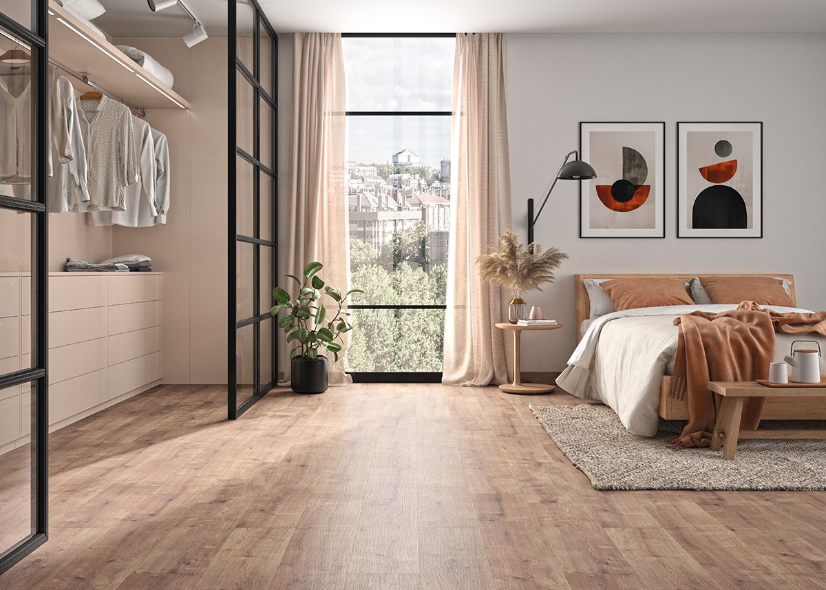 Pavimento flutuante laminado 29T Carvalho Tobacco. Integrado na coleção Exitus, combina estética clássica com funcionalidade moderna. Com uma tonalidade quente e tostada e um acabamento que valoriza os veios marcados e as variações de cor, cria ambientes mais naturais e envolventes, adaptados a diferentes estilos de decoração.