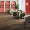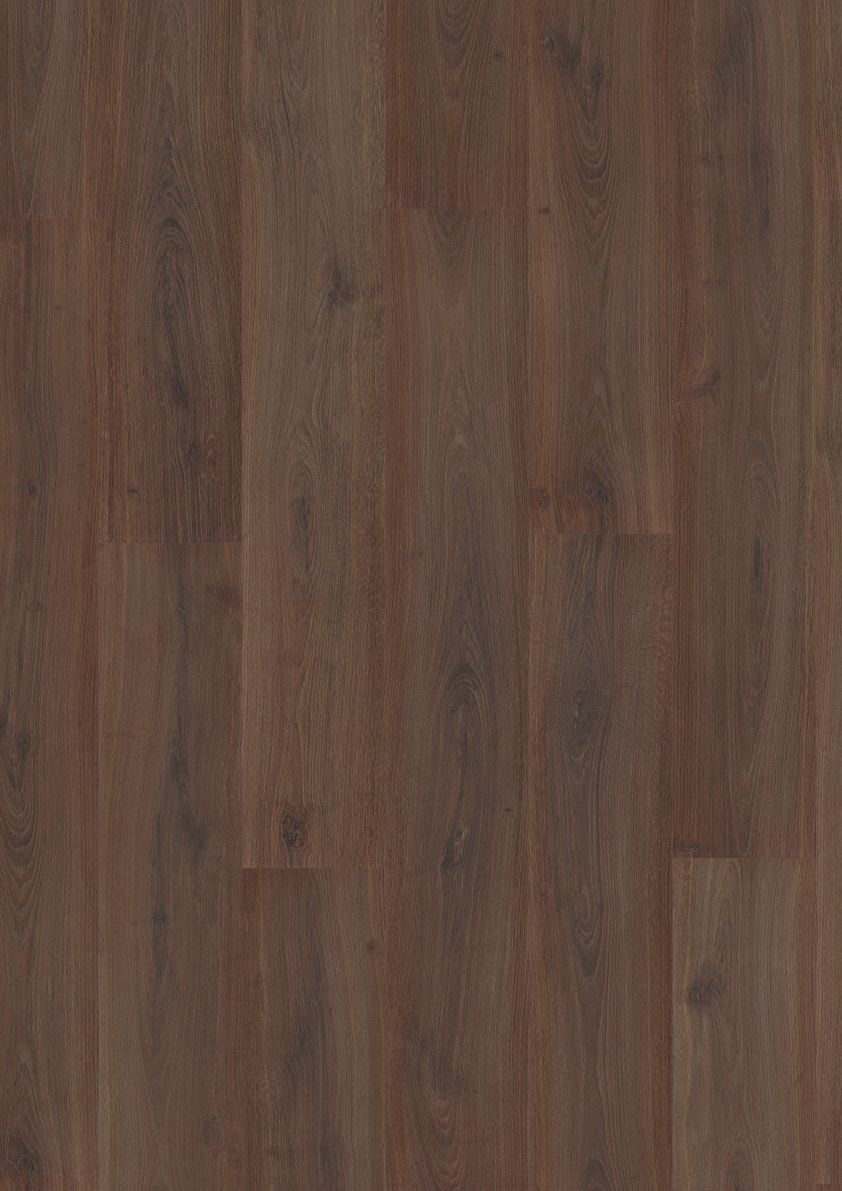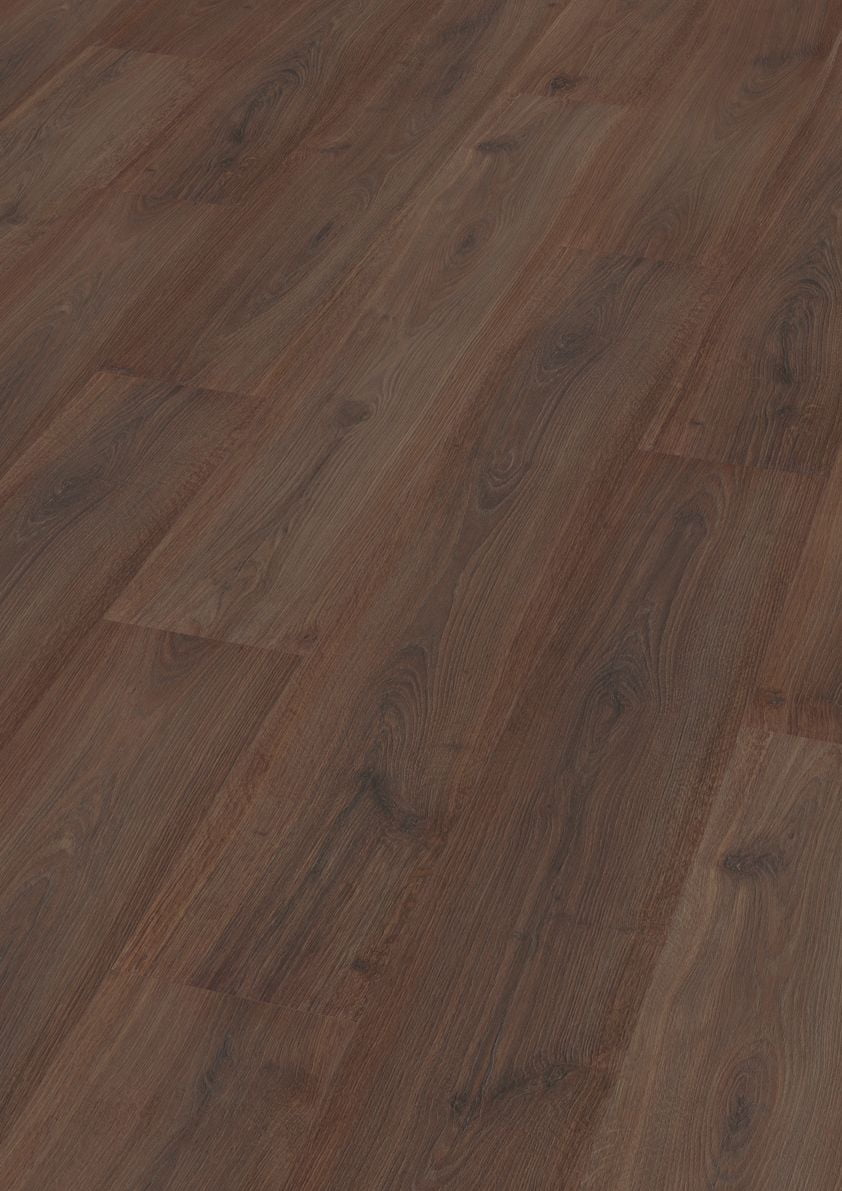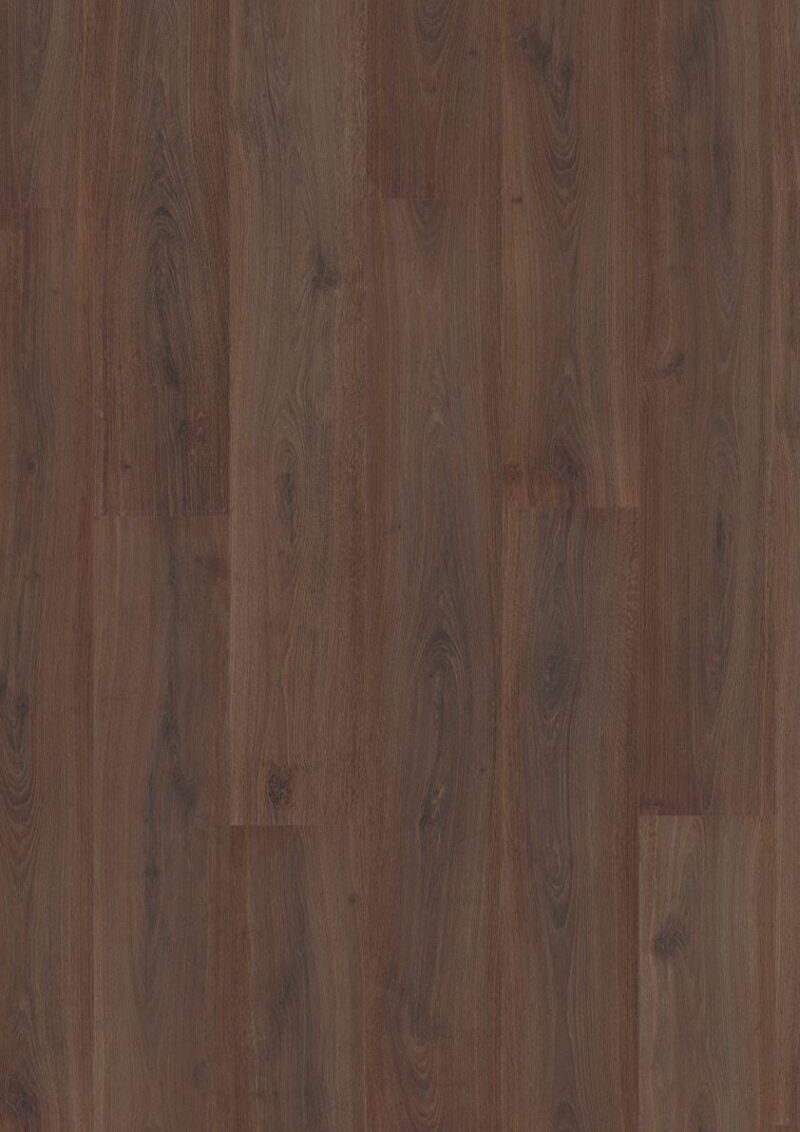O pavimento flutuante laminado 312B Noz Kalas Oak apresenta um padrão de carvalho escuro com fendas e nós marcados, criando um ambiente envolvente, distintivo e elegante. A textura do piso, perfeitamente sincronizada com o desenho da madeira, intensifica o realismo da superfície e reforça a profundidade visual do conjunto.