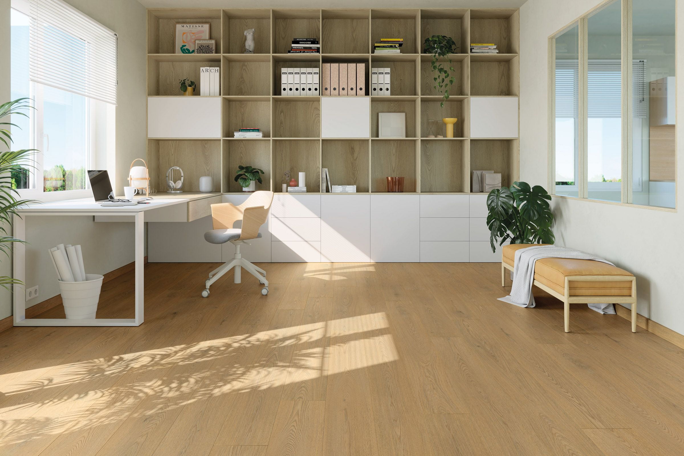 O pavimento flutuante laminado 341B Tavira Fado Oak apresenta um tom de carvalho envernizado natural que preserva a sensação acolhedora do lar, mesmo em ambientes multifuncionais. A sua expressão equilibrada permite uma integração harmoniosa em espaços interiores ou exteriores cobertos, reforçando conforto visual, continuidade estética e rigor técnico.