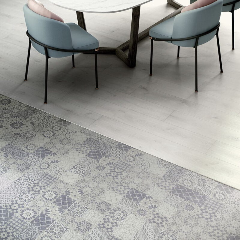 O pavimento flutuante laminado 6AQ Alfama Tile inspira-se nos azulejos tradicionais portugueses, reinterpretando o seu encanto clássico através de padrões vibrantes e de um carácter marcadamente pessoal. O acabamento Dover, com textura de pedra, enfatiza a profundidade gráfica e intensifica o realismo visual da superfície.