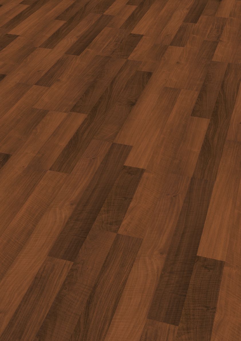 Pavimento flutuante laminado 86N Garapa. O acabamento Rustic Pore realça a profundidade e o carácter natural da madeira, conferindo-lhe um aspeto elegante e refinado. Com uma tonalidade quente marcada pela alternância de tons escuros e avermelhados e um acabamento que valoriza a textura rústica das duas réguas, cria ambientes mais sofisticados e envolventes, adaptados a diferentes estilos de decoração.