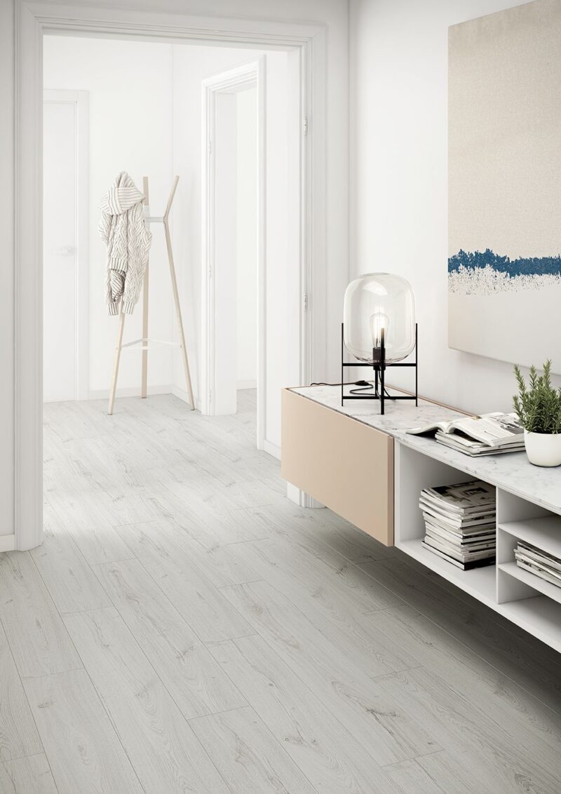 O pavimento flutuante laminado 8AK Albar Kalas Oak apresenta um padrão característico de carvalho branco com fendas e nós, desenvolvido para conferir naturalidade e luminosidade a qualquer espaço. A sincronização entre a textura do pavimento e o padrão da madeira reforça o realismo da superfície e acrescenta profundidade visual ao design. Ideal para projetos que valorizam ambientes claros, autenticidade e rigor técnico.
