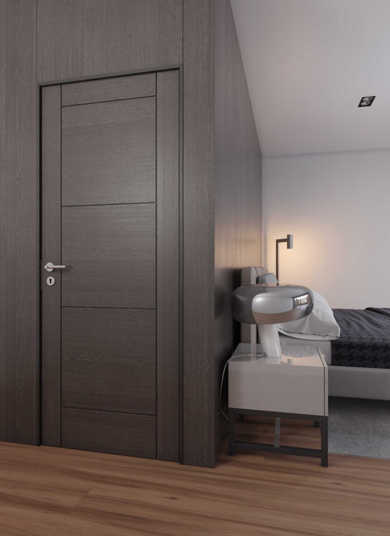 A Porta de Interior Lacado Bronze – Modelo 314 é uma solução versátil e contemporânea, caracterizada pelo seu friso decorativo horizontal de 5 mm, que confere uma identidade única. Disponível em múltiplas configurações, com ou sem elementos envidraçados, adapta-se a diferentes necessidades funcionais e linguagens de projeto. O acabamento lacado bronze assegura uma superfície uniforme, de fácil manutenção que se envolve no design da arquitetura interior.